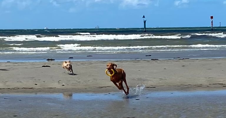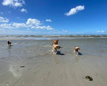 A popular third visit for January because the conditions, space, and safety make it a standout. The huge shallow flats allow even less confident swimmers to enjoy the water, while social dogs have plenty of opportunities to mingle. It is consistently one of the happiest places for off leash play. Ideal for energetic dogs with good recall.